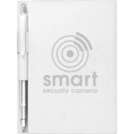 The 4.5" x 6" Baldwin Notebook is a paperback bound, recyclable notebook with 100 ruled pages and a paper pen loop integrated into the notebook spine. It also includes a matching color ballpoint pen. A pen imprint is not available.