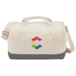 The Belair Cotton Canvas 17" Duffel shows off fun color-blocking and natural cotton canvas. This tote features zippered main compartment, cotton webbing shoulder strap and cotton grab handles. This duffel makes a great companion whether it's a short weekend getaway or a trip to the gym.