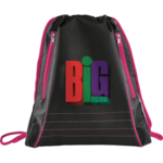 The Neon Deluxe Drawstring Bag features color pop accents, stitching and piping throughout and an open main compartment with a cinching closure and two easy access zippered pockets on the front.