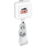 Retracting cord extends 32". Belt clip on back. Great for tradeshows and employee badges. Can also be used as a key ring holder.