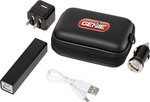 Handy kit features a sleek black EVA carrying case, containing one 2200 mAh UL certified power bank, one UL listed wall charger with foldable plug, and one USB car charger