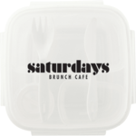 The Salad To Go Container includes a removable compartment tray that holds a dressing container and nests neatly on top of the container. A fork and knife are included on the inside of the lid. This piece meets FDA requirements and is BPA free.