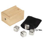 Bullware set includes four stainless steel beverage cubes that will keep your drink cold and not water it down like ice. Food grade stainless steel. Includes velvet pouch and Bullware wooden box packaging.