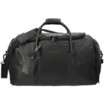 Classic leather duffel with luggage tag for deco. Spacious main compartment with printed Kenneth Cole lining. Zippered side pocket. Side shoe compartment. Adjustable and removable padded shoulder strap and button-closure carry handles complete this luxurious bag.