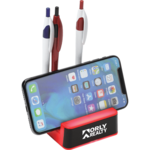 Light up your home office or work space! The Glint Light Up Logo Desk Stand is used for holding a phone in the front panel, and pens, highlighter, name cards, or notes in the back. Logo will light up for 20 seconds every time you put the phone into that position. Only laser imprint would make logo light up. Remove battery isolator before use. This item must be lasered to reveal the light up function.
