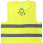 The Safety Vest is a neon yellow safety vest with reflective stripes. One size fits most up to XL. Hook and loop closure on the front.