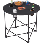 Celebrate your next tailgate or picnic with this folding round table! Or prominently display your logo at a tradeshow or company event while entertaining your guests. The table is light-weight and easy to transport and assemble/disassemble. Features a sturdy steel frame, durable 28.5” diameter 600D table top, and four (4) integrated mesh cup holders. Table-top height is 23.5” off the ground. Some assembly required. Available for one-day turn with Sureship®.