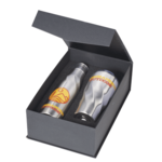 Great choice! Includes the Hugo bottle 1625-80 22oz and Hugo Tumbler 1624-89 20oz. Durable, double-wall stainless steel vacuum construction with copper insulation, which allows your cold beverage to stay cold for 24 hours and at least 8 hours for hot beverages. The construction also prevents condensation on the outside of the piece. Leed's Exclusive. Gift box is not decorated. There might be a tiny color variance across the components in a set. “For additional protection, all Drinkware pieces will be individually polybagged and inserted in the gift box.” Laser engraving silver Drinkware will result in a subtle, tone on tone decoration