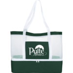 The Mesh Outdoor 12-Can Cooler Tote features an open mesh main compartment with a hook and loop closure. It comes with a large front pocket, double 30" handles and a zippered insulated drop bottom to keep beverages and food cold.