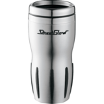 Stainless steel thumb-slide lid for easy drinking. Double-wall construction. Stainless steel liner. Rubber-striped grip for easy handling. 14oz.
