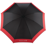 Manual open umbrella. Pongee canopy with 4” color trim and black piping. Fiberglass shaft and frame. Windproof frame construction. Textured EVA foam handle. Plastic safety tips. Available for one-day turn with Sureship®.