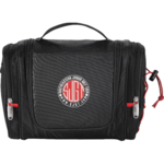 Zippered main compartment with U-shaped opening. Front hook and loop pocket. Two side zippered pockets. Elastic shock cord on exterior side pocket for additional storage. Interior includes zippered mesh pocket and deluxe organization in the form of multiple pockets and elastic dividers. Metal hook hanging feature for convenience. Top grab handle for easy carry. Signature elleven™ lining and hardware.