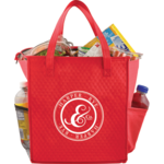 The Deluxe Non-Woven Insulated Grocery Tote is insulated with a heat-sealed, water-resistant lining and features a large zippered main compartment, two side pockets, rear ID window, and unique embossed dots exterior.